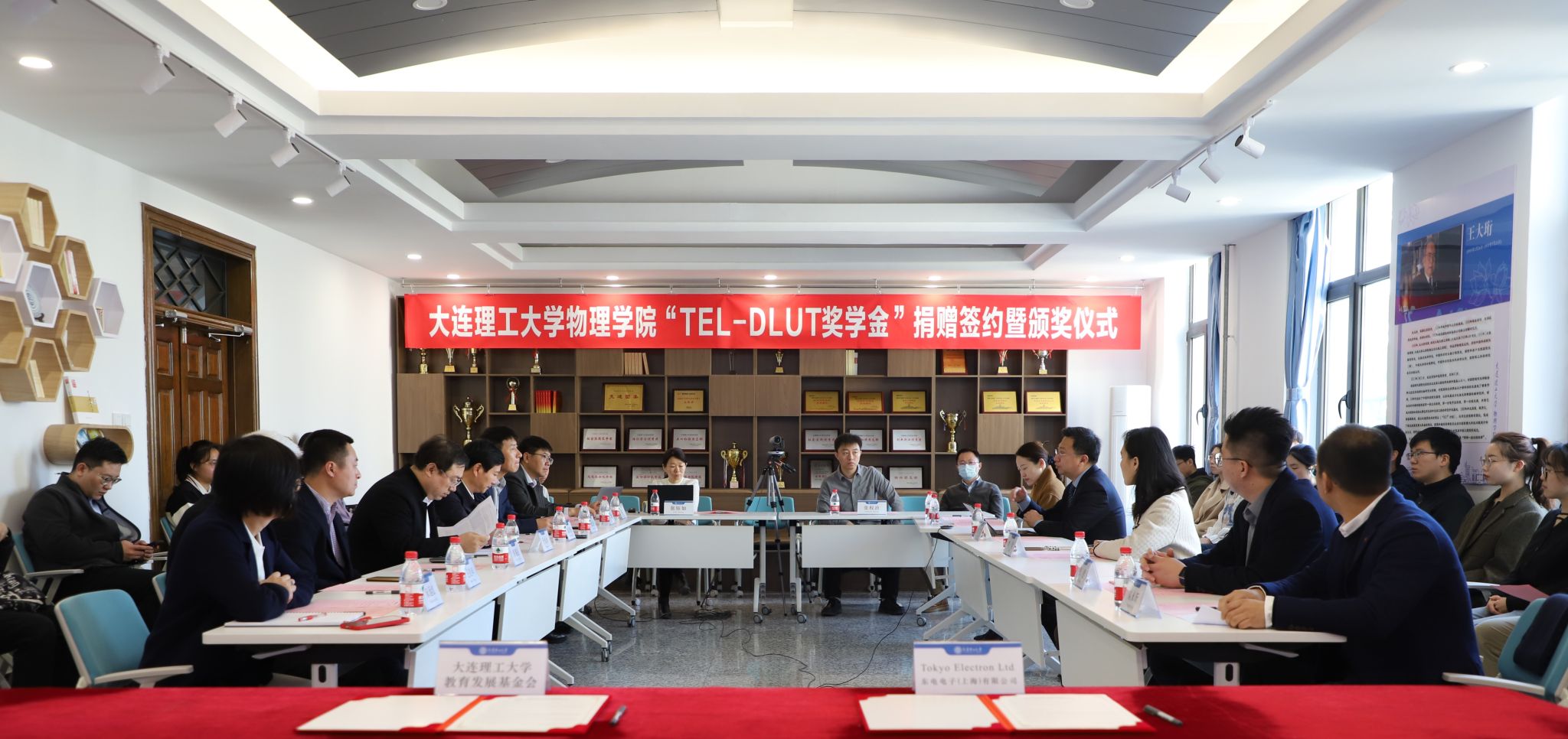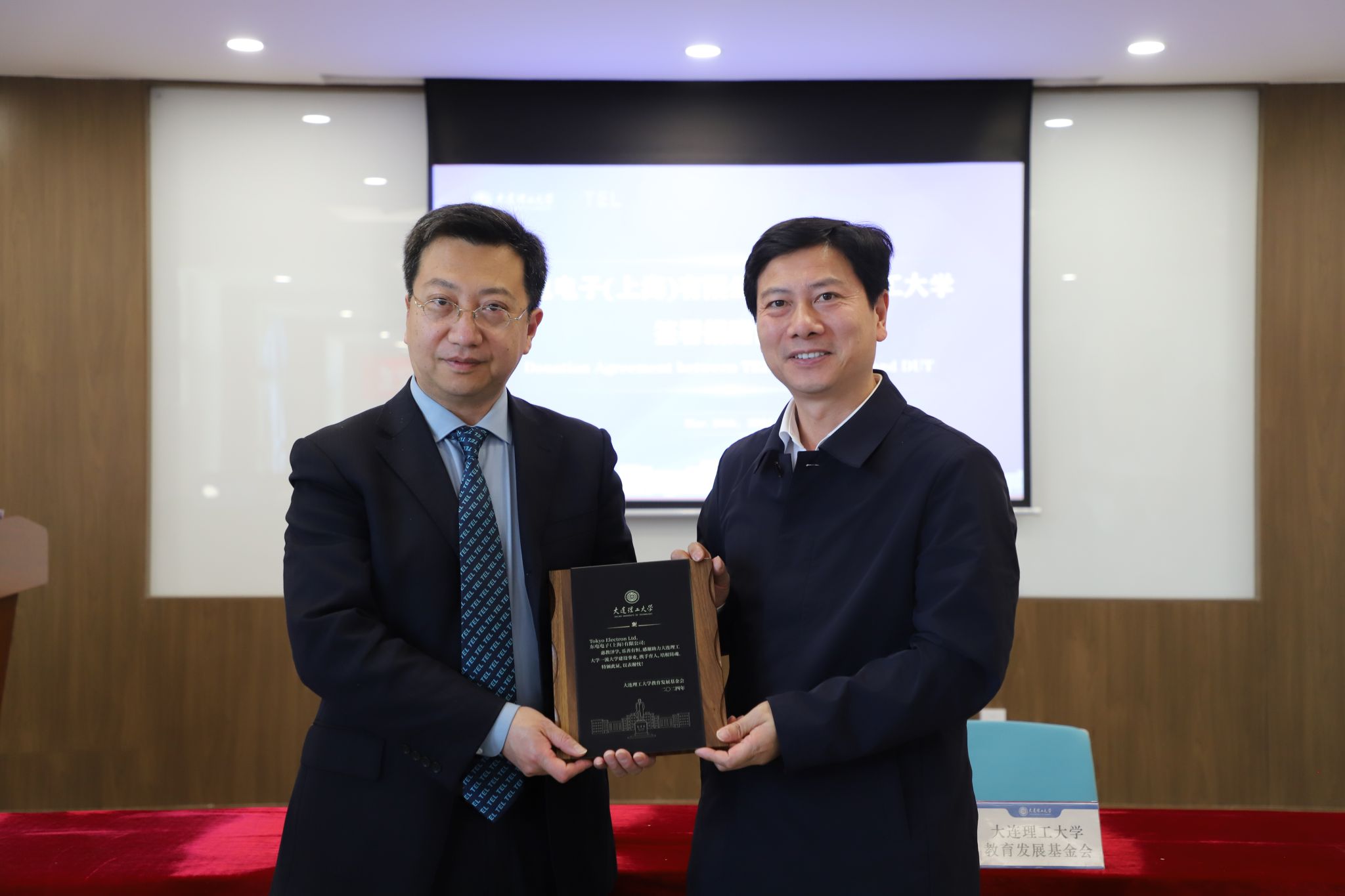 东电电子(上海)有限公司钱立群总监与大连理工大学国内合作与联络处处长杨克旭签署捐赠协议。