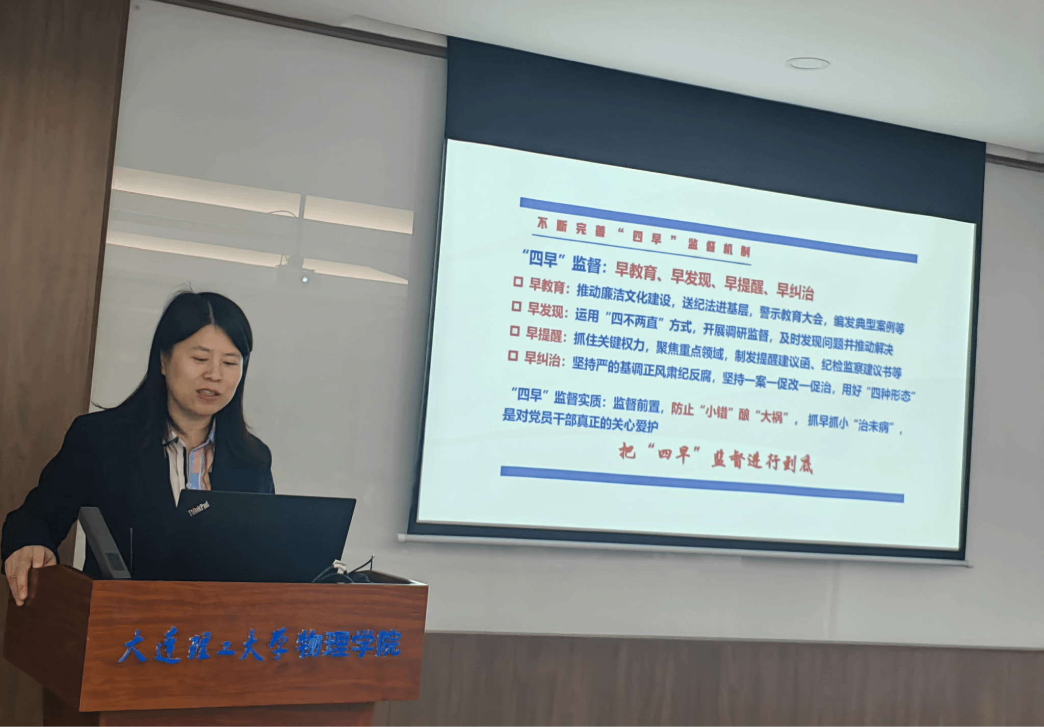为贯彻落实党纪学习教育,进一步向基层党组织普及相关法纪法规,加强基层党组织的政治建设,大连理工大学纪检监察机构于2024年4月25日下午2:00在好博官方网站322室成功举办“送纪法进好博官方网站”主题讲座,本次讲座由好博官方网站党委副书记于艳敏同志主持,学院党委委员、纪委委员和各党支部代表参会;大连理工大学纪检监察机构副主任孟秀英同志作为主讲人,为参会人员讲授一场生动的纪法学习党课。