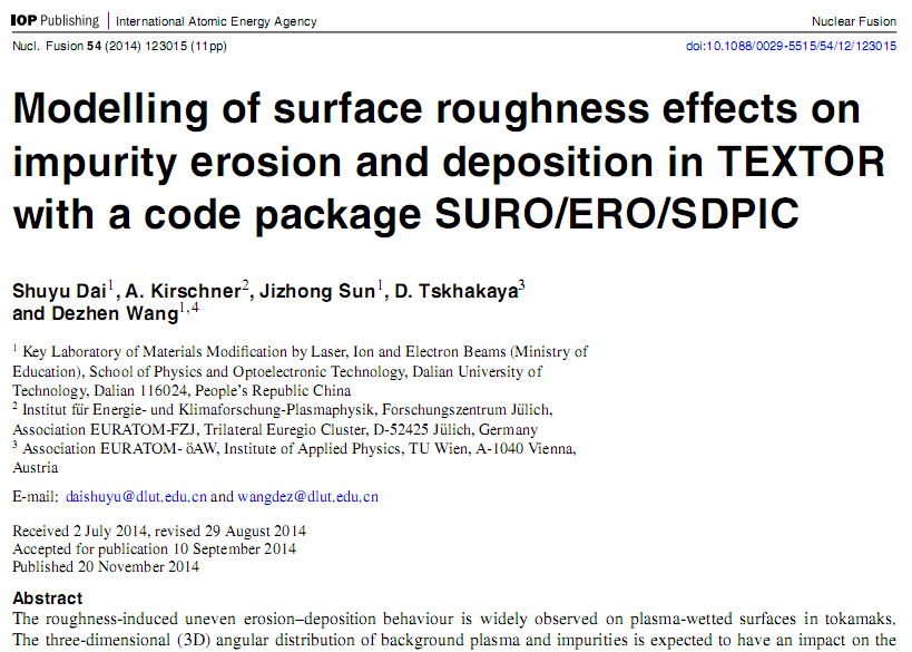 近日,好博官方网站青年教师戴舒宇关于核聚变装置中粗糙表面上杂质输运和沉积的三维模拟研究成果最终发表在国际核聚变领域最具权威期刊《核聚变》(Nuclear Fusion)。这篇文章经过4位审稿人的严格评阅,最后得到了他们对工作的一致肯定,其中一位审稿人还给出了"excellent paper"的评价。这项研究成果的开展是建立在之前的二维模型基础上开展的(Dai S Y et al 2013 PPCF 55 055004),该二维模型的文章被欧洲同行多次引用;最新的三维模型的模拟结果与TEXTOR和Tore Supra等聚变装置上的实验结果有很好地吻合,这也为后续的工作的开展打下了良好的基础。此外,该项工作也得到了王德真教授和孙继忠教授的支持和帮助。《核聚变》期刊是由国际原子能机构主办的可控核聚变领域的顶级杂志。我国每年在该期刊发表的文章在10篇左右,并且主要以实验文章为主。本研究工作得到了ITER专项基金、国家自然科学基金、中国博士后科学基金、辽宁省高等院校科学研究项目的联合资助。