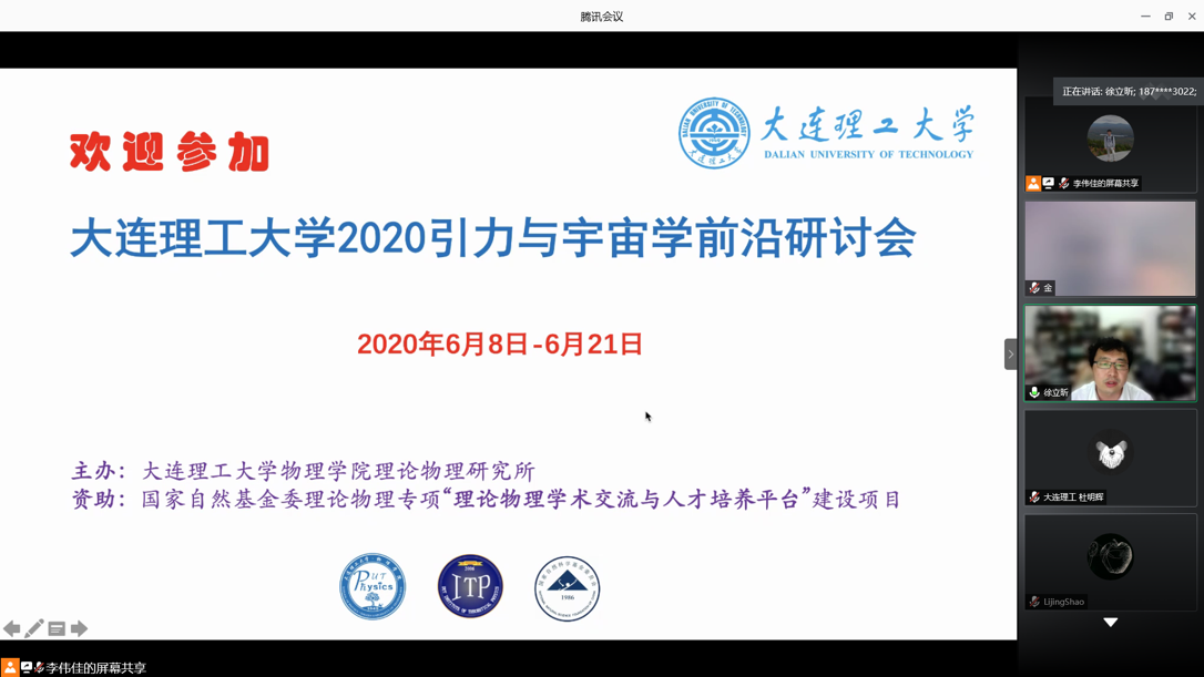 2020年6月8日-6月21日,由好博官方网站理论物理研究所主办的“大连理工大学2020引力与宇宙学前沿研讨会”成功召开。本次会议受国家自然基金委理论物理专项“理论物理学术交流与人才培养平台建设项目”资助,组织者为大连理工大学徐立昕教授和李伟佳副教授。会议采用了“腾讯会议”进行线上学术交流,共有中科院及海内外50余所兄弟院校和科研院所的100余名引力与相对论领域的专家报名参会(峰值在线人数为160余人)。