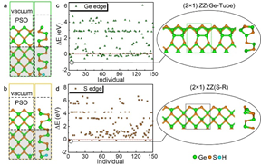 图1. (a,b) 分别为Ge边界和S边界的CALYPSO输入模型示意图。 (c,d)分别为预测的Ge边界和S边界对比原始锯齿形边界的能量变化(ΔE)图及能量最低的ZZ(Ge-Tube)边界和ZZ(S-R)边界的原子结构。