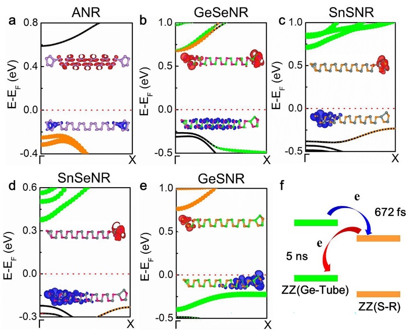 图3. (a-e) 重构的α相单层纳米带的边界原子投影能带图及带边分解电荷密度图。(f) 电子和空穴在GeSNR的ZZ(Ge-Tube)和ZZ(S-R)之间的分离复合过程示意图。