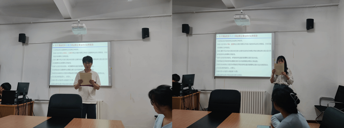 大会第一项,就预备党员马方方同志与王欣杰同志转为正式党员的事宜进行讨论。首先,两位同志依次将预备考察期间的个人情况向大会作出汇报,并表明入党决心和转正意愿。随后,由入党介绍人分别对两位同志的主要表现发表意见,并对其能否按期转正表明态度。与会党员对两位同志能否按期转正进行充分的讨论,有表决权的正式党员对两位同志能否按期转正进行无记名投票,表决结果为一致同意马方方同志和王欣杰同志按期转为中共正式党员。