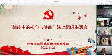 为贯彻落实党中央关于常态化疫情防控的决策部署和认真学习领会习近平总书记关于疫情防控工作重要讲话和指示精神,庆祝建党99周年,响应学校党组织“举办一堂专题微党课、召开一场组织生活会、打造一个教育素材库、构筑一道‘红色防火墙’”活动,2020年6月25日下午,好博官方网站硕博理论物理党支部通过视频会议的形式举办了“战‘疫’中的初心与使命”线上组织生活会暨《在战“疫”中展现共产党人政治本色》微党课,支部7名党员均出席会议。