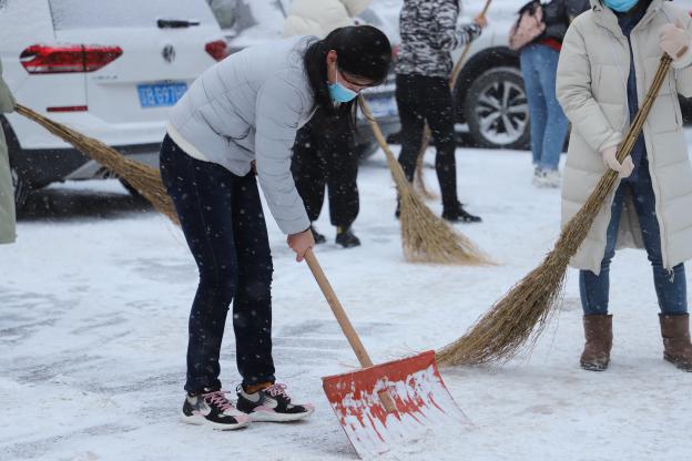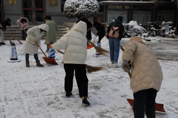 扫雪过程中,支部同志积极参与,干劲十足。大家不顾天寒路滑,有的扫、有的铲、有的推,齐心协力,呈现出一派热火朝天的扫雪场景。经过近一个小时的认真清理,系楼楼前出现了一条干净整洁的通道,保证了师生出行的方便。