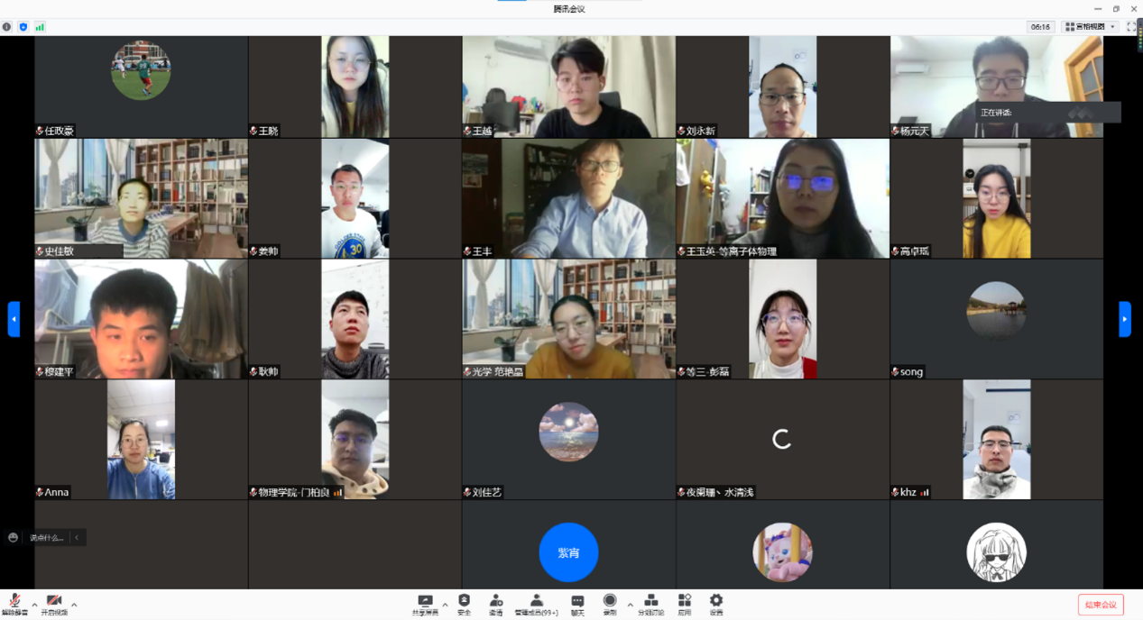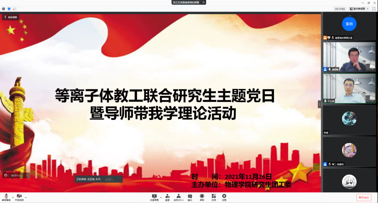 为响应学院党委关于加强深入学习党的十九届六中全会精神要求,发挥基层党支部宣传群众职能。同时为及时了解并解决疫情期间研究生遇到问题,2021年11月26日,好博官方网站等离子体物理教工和硕博学生党支部通过腾讯会议开展了以学习党的十九届六中全会精神和解决疫情“封校”期间问题的联合主题党日活动。等离子体物理教工党支部书记桑超峰教授讲解了党的十九届六中全会的主要内容并和相关精神,三名等离子体学生党支部书记对疫情期间研究生心理、科研等方面存在的问题进行反馈,好博官方网站党委书记王正汹教授、副院长高飞教授等对疫情封校后同学们反映的所遇到的问题予以解答并提出应对方法。活动受到老师同学积极响应,共有187人参会,其中老师25人,学生162人。