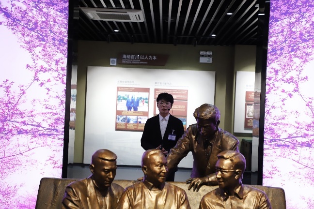 活动伊始,同学们跟随着讲解员的步伐,有序进入展厅。讲解员同学对序厅、沿革厅、人物厅、校友厅、国际礼品厅等五大展厅展开详细的讲解。