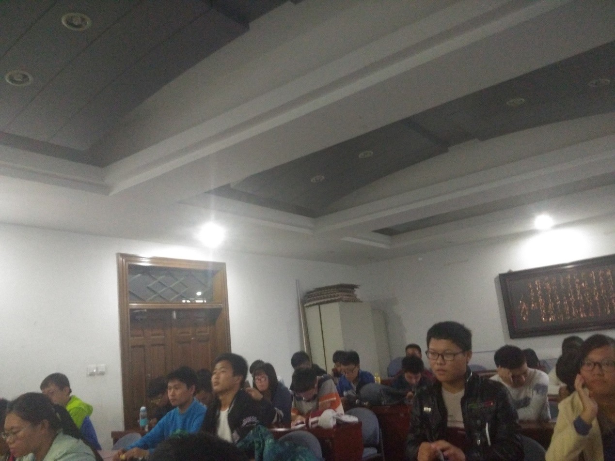 在整场大会之前,先放了自强社的社歌《梦在远方》活跃了现场的气氛。然后大会开始,首先由物理自强社副社长宣读自强社社员名单,让社员认识了部长和副部。接着由社长讲话,向新生们介绍了自强社这个团体,让新生们了解到了自强社这个组织存在的意义及其重要性。之后我们自强社的指导老师梁勇老师开始讲话,他以极其亲民的口气,就像是我们的学长和哥哥一样,没有一点老师的架子。然后就到了游戏环节,首先是一个破冰游戏,虽然是一个简单的游戏,但是同学们玩的还是津津有味,而且可以明显感到同学们的热情以及认识新同学的快乐。游戏之后由组织部、办公室、文体部进行PPT展示。让同学们了解到了这些部门的职能。接着又是一个破冰游戏,大家依旧玩的很开心。接下来就是由由义工部、实践部、新闻部进行PPT展示。也同样让新生们了解到了这些部门的职能。在大会的最后,由全体社员齐唱社歌来结束了见面会。