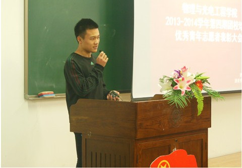 大会第三项是由我院团委青年志愿者协会会长王加彬进行的青协年度工作汇报,并表彰了宋思琪,曾祥宇等年度优秀志愿者以及叶旭映,贺婷等团校培训优秀个人。随后由优秀青年志愿者代表宋思琪发言。最后,由佟西原老师进行大会总结。至此,大会圆满结束。