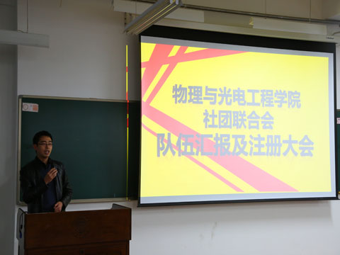 物理与光电工程学院社团联合会队伍汇报及注册大会于12月18日在西部综合楼B106教室召开。校社团联合会指导老师冯丽芳老师,物理与光电工程学院团委书记佟西原老师,校社团联合会副主席郑晶,李冠基,电子信息与电气工程学部社团联合会主席全欣,建设工程与力学学部社团联合会主席耿冲,好博官方网站学生会主席兼团委副书记刘聪越,好博官方网站团委常务副书记金美晨以及好博官方网站团委,学生会,社团联合会的各部长出席会议,由好博官方网站社团联合会主席孙长鹏主持会议。