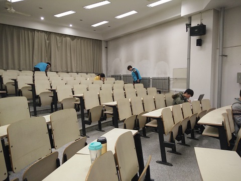 活动从晚九点半开始。参与活动的21人分成两组,带上清洁工具,分别清理了综一西侧和东侧的共计十八间教室。其中一组采取了“集中力量一起干”的方式,从一楼开始一层层向上进发,全组集中清理;另一组则采取了小组责任制,每小组负责一层。各小组分工明确,清理抽屉、打扫地板、整理讲台,同学们各司其职,认真负责地开展工作,将废纸、食物残渣等垃圾一一清理,并且细心地将讲台、黑板擦拭干净。