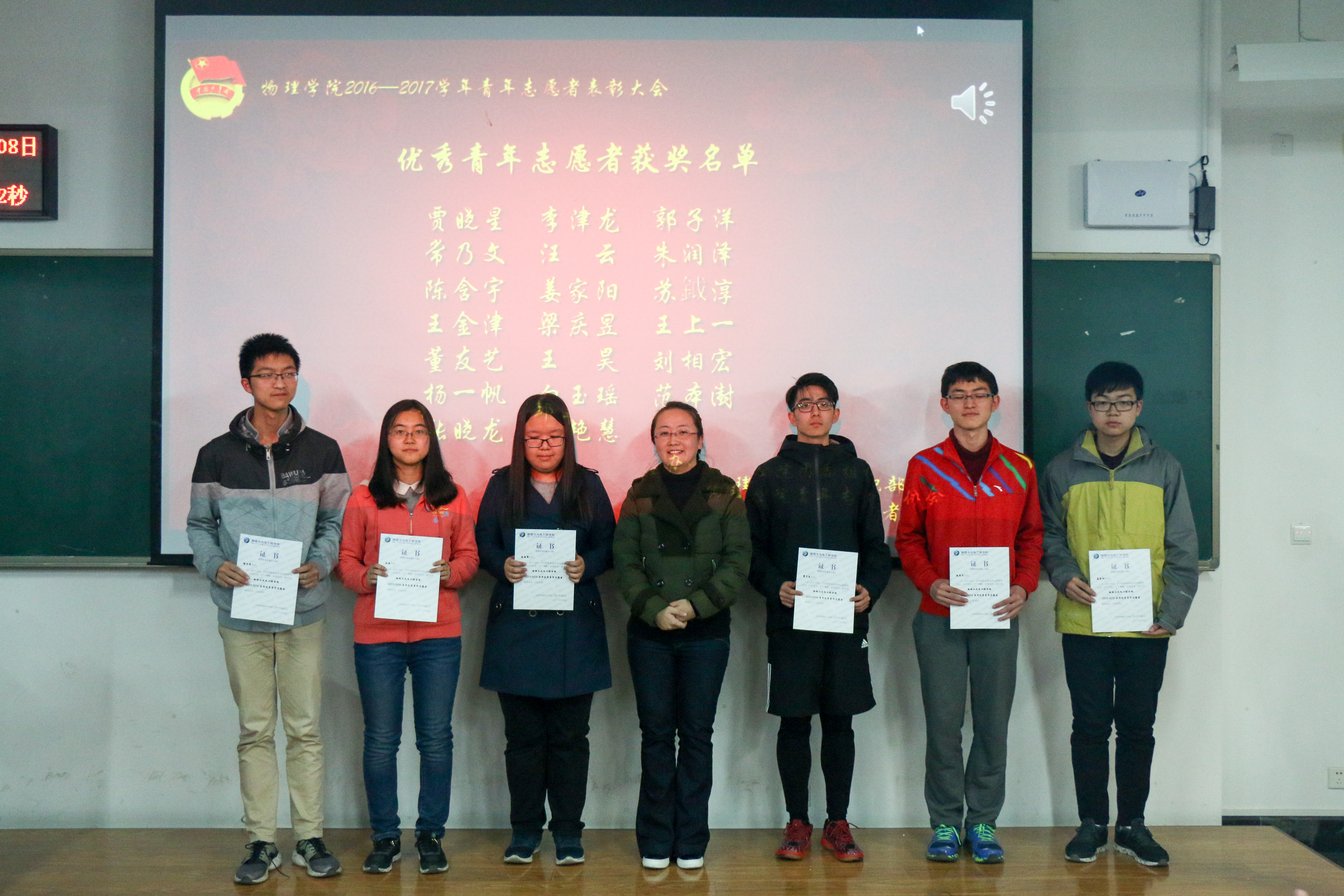 之后,大会进行到第三项——青年志愿者协会表彰大会。青年志愿者协会会长王昊上台致辞,王昊会长上台介绍了过去半年里青年志愿者协会举办的种种活动和成果,号召更多的同学投入到志愿者活动中来。致辞完毕后,纪丹红书记为获奖的优秀志愿者颁奖,并拍照留念。最后,优秀志愿者代表上台分享自己曾经参加志愿者活动时的经历和感想。