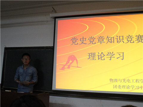 10月17日晚,由物理与光电工程学院团委理论学习中心举办的党章党史知识竞赛于机械馆112顺利进行。出席本次竞赛的嘉宾有物理与光电工程学院团委组织部部长孙景毓,团委讲坛部部长吴梦添以及理论学习中心主任朱绍英,此外,校理论研究会副部长李晓龙、校“两组”学习部干事李一凡和金晓晗出席本次比赛,并担任本次比赛的评委。经过激烈的竞赛,最终,宋斯琪小组荣获一等奖,赵沁华小组荣获二等奖,杨丽萍小组荣获三等奖。