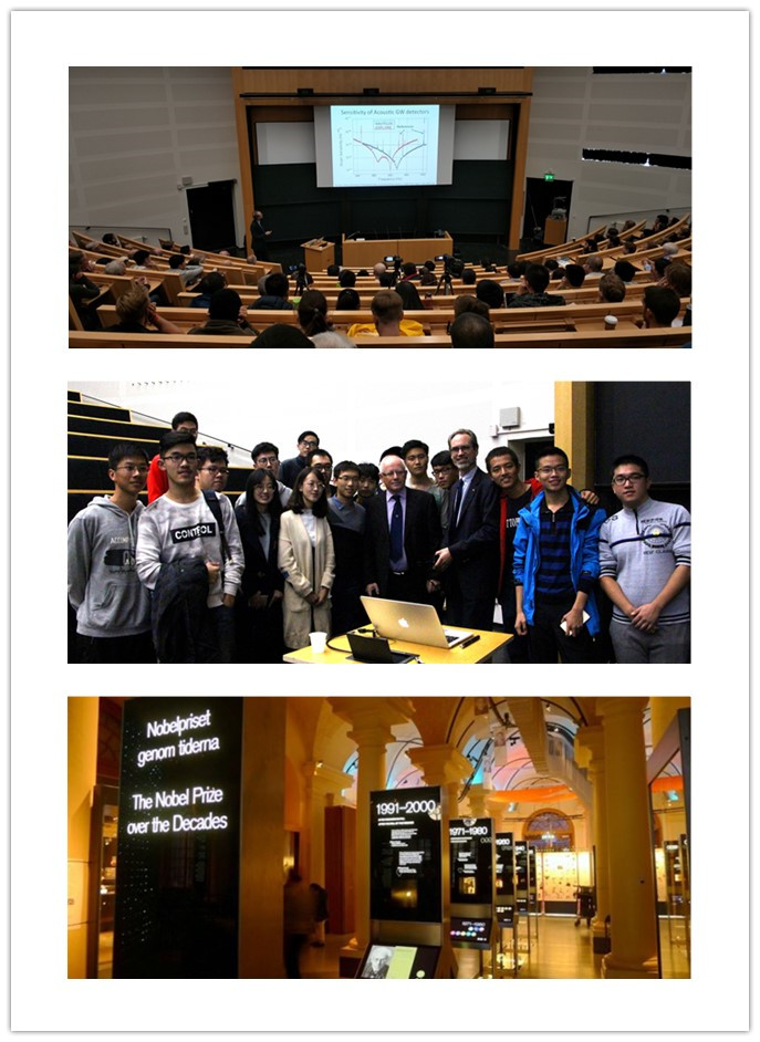 瑞典当地时间10月3日11点50分,瑞典诺贝尔委员会宣布将2017年度的诺贝尔物理学奖授予美国物理学家外斯(Rainer Weiss),巴里什(Barry Clark Barish)和索恩(Kip Stephen Thorne),以表彰他们为LIGO(激光干涉仪引力波探测装置)探测器建设以及引力波探测所作出的贡献。当天下午,团队学生有幸亲临皇家工学院著名的奥斯卡报告厅,聆听诺贝尔物理学奖评审委员会Jóhannsson教授主讲的诺奖说明会。虽然对于一些专业术语一知半解,但是学生们还是利用这次最近距离接触诺奖的机会,与Jóhannsson教授进行了更进一步的交流;会后,为了更深入的了解诺奖,学生们组团来到了当地久负盛名的诺贝尔博物馆,馆中按照时间顺序排列介绍的诺贝尔过去100年的成就让学生们无比震撼。这次诺奖体验为师生团队留下了身处全球物理学界焦点的宝贵记忆,是本次访学活动中令人惊喜的收获。