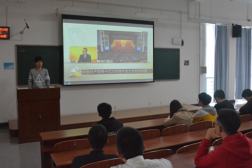 活动开始前,1506班班长逄金鹏介绍了十九大相关情况。大会于18日上午九时在北京人民大会堂开幕,会期为10 月18日至10 月24 日。在全面建成小康社会决胜阶段、中国特色社会主义发展关键时期召开的党的十九大,将向世界明确宣示——在中国共产党的领导下,中国人民将继续高举中国特色社会主义伟大旗帜,坚定不移沿着中国特色社会主义道路,向着实现民族复兴的伟大梦想奋勇前进。