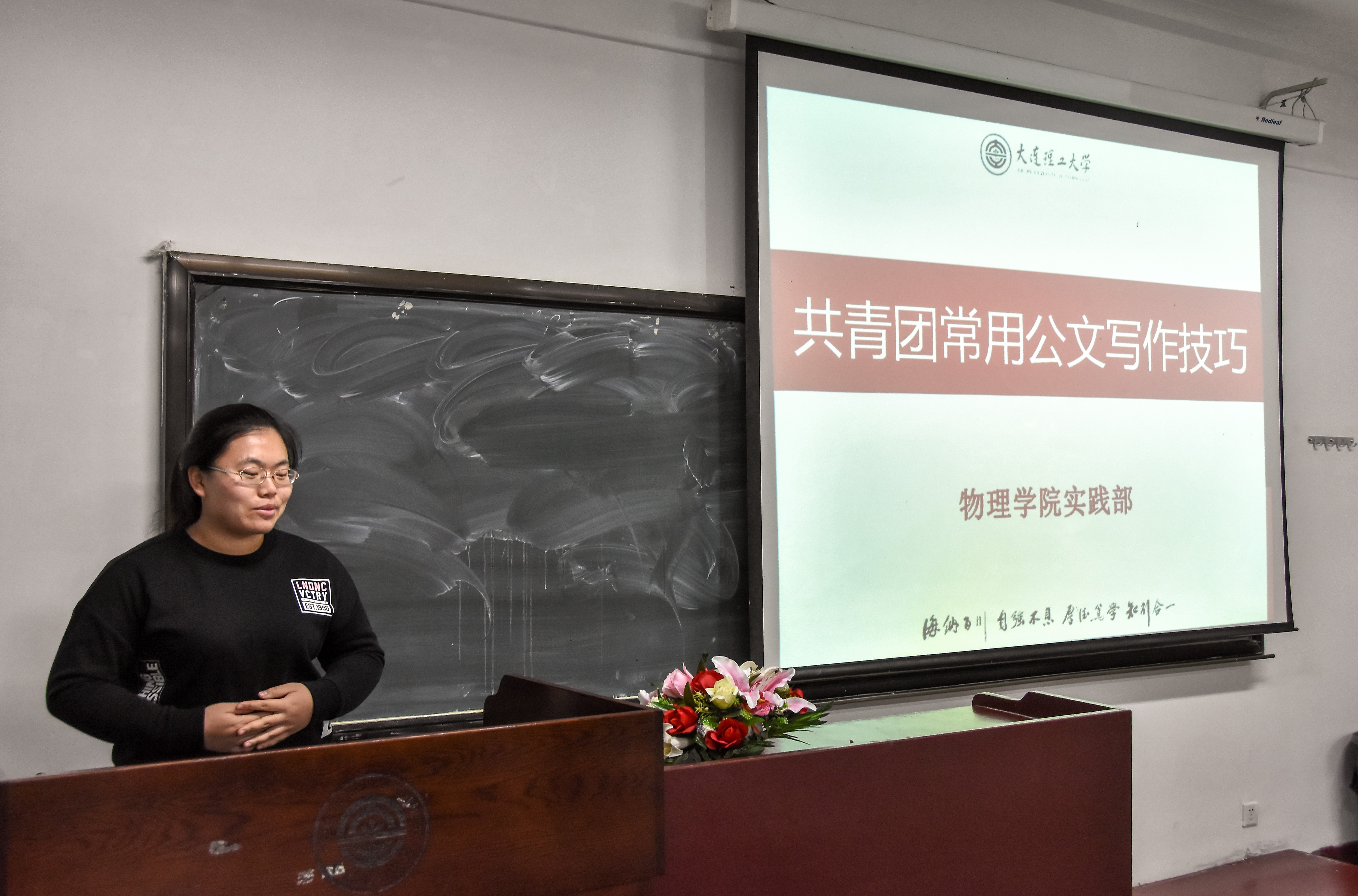 刘璐主要对共青团常用公文写作技巧进行指导,她结合共青团常用公文特点和我校、我院共青团工作实务,介绍通知、函、工作计划、工作总结、大事记、条例证明信、邀请函、新闻稿等应该重点掌握的公文的写作方法和技巧,每种文体都从标题、正文等细节举例子详细介绍,最后对提升公文写作技巧给出一些建议。