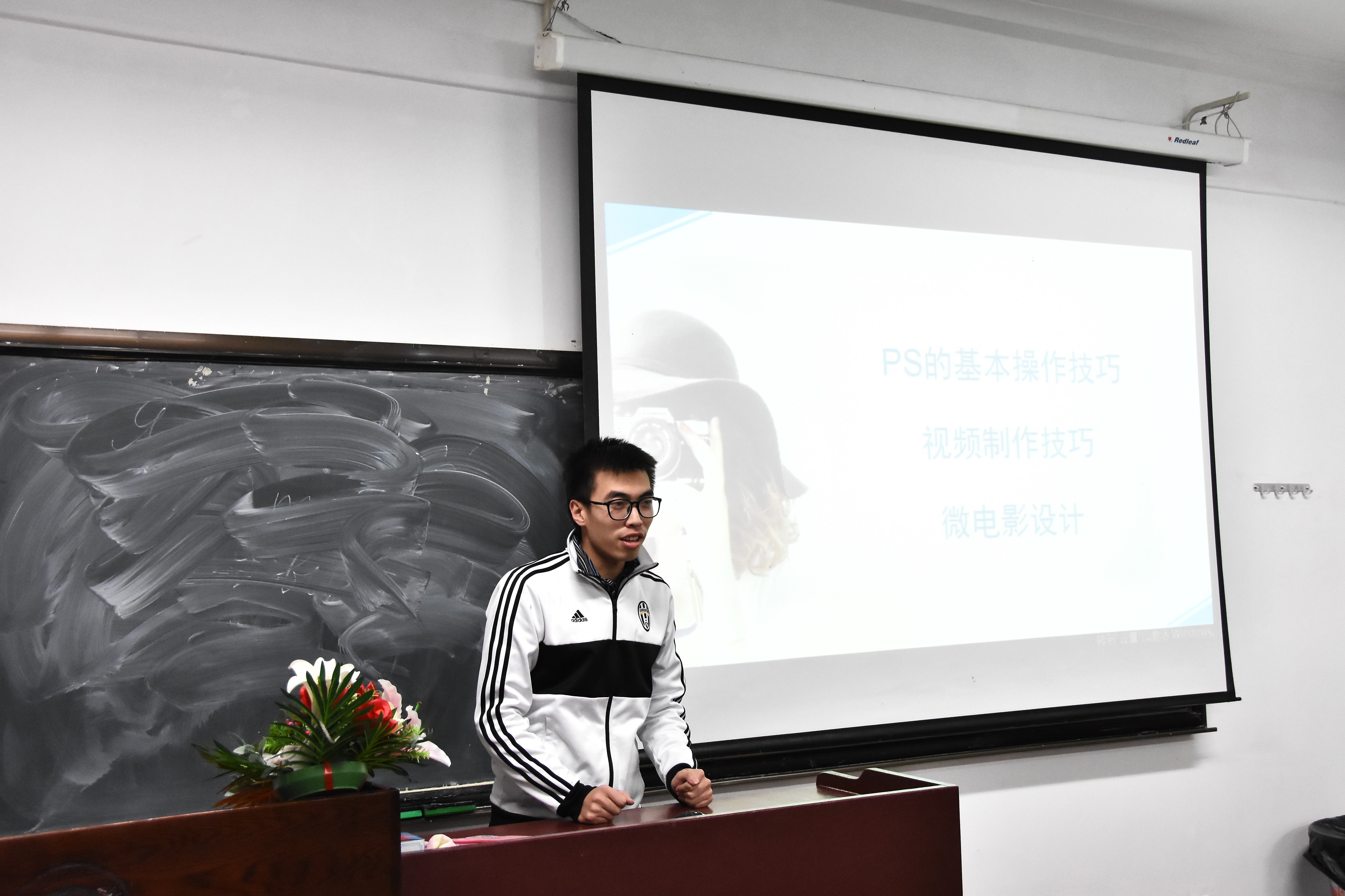 活动在嘹亮的团歌声中拉开帷幕。首先由微梦电影制作协会的庞序韬为同学们讲解ps的使用技巧、视频的剪辑以及宣传片的制作。ps作为一款在平面设计、修复照片、广告摄影等方面功能十分强大的软件,在日常生活工作中有着广泛的应用,也是同学们都想要学习的软件。庞序韬学长为同学们详细的讲解ps的使用方法,并亲自上手操作示范,让同学们对ps的使用方法有一定的认识。然后庞序韬学长又为同学们讲解剪辑视频的种种方法和技巧,包括视频的转场、添加字幕、添加音频等,然后又结合自己的亲身经验讲解了很多关于宣传片制作的心得和注意事项,为想要制作视频的同学有很大的帮助。