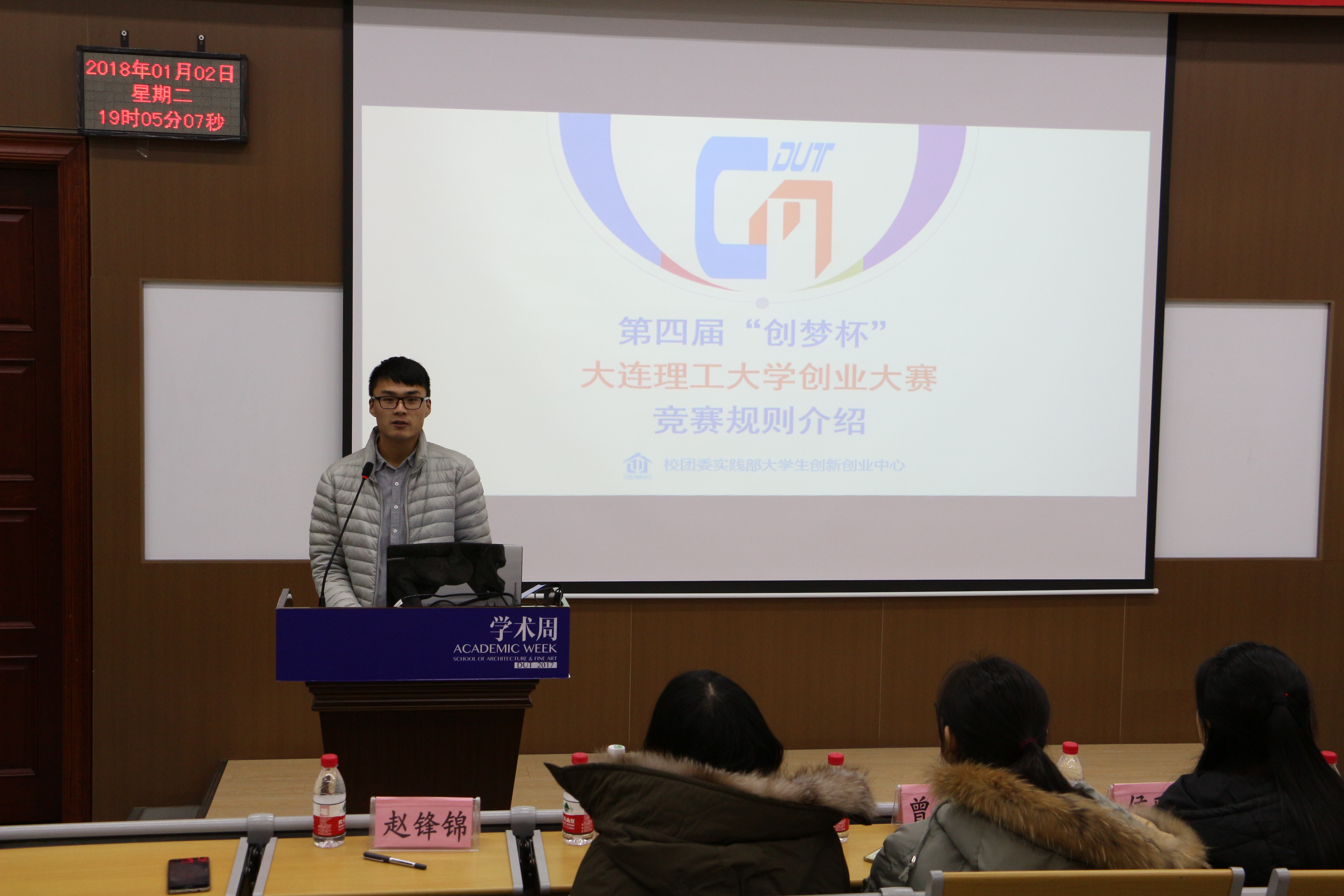 随后,赵锋锦上台从推进步骤、作品类别、比赛要求、决赛直推、奖项设置等五个方面详细地讲解本届创梦杯校赛的规则。之后曾译莹又对创梦杯院赛的规则进行讲解,就同学们参加创梦杯的有关注意事项进行指导。