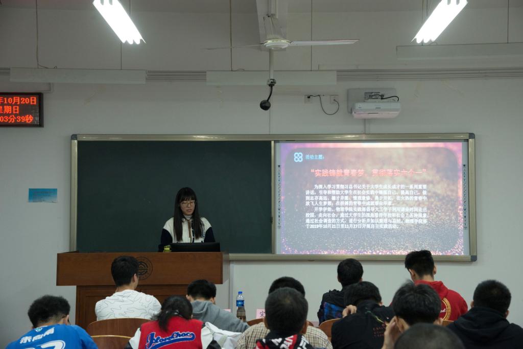 2019102018:002019-2020自主实践月活动在综合二号教学楼A306教室顺利举行。出席本次活动的嘉宾有学生会主席王栋梁,常务副主席宋玺尧,组织部部长温荣贤,实践部部长唐雯月和实践部副部长陶艾龙。
