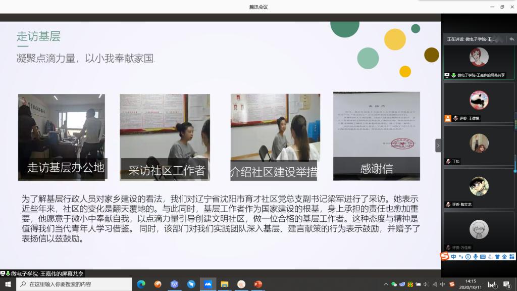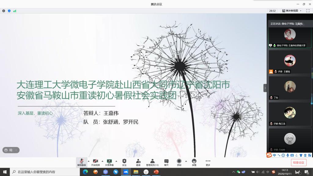 共有3支团队参与此次答辩,他们分别是大连理工大学微电子学院赴湖北省武汉诸市“抗疫,我们在行动”暑期社会实践团,大连理工大学微电子学院赴山东省东营市踏改革之浪,与时代俱兴暑期社会实践团,大连理工大学微电子学院赴山西省大同市、辽宁省沈阳市、安徽省马鞍山市“重读初心”红色筑梦暑假实践团。答辩分为两个环节:3分钟PPT展示,1分钟评委提问。3支队伍的共同优点是成员分工明确、预期安排细致完整。调查过程中大多团队采用团队选择线上采访、问卷等调查形式。由于疫情原因,实践队员们分居各地展开实践,通过线上沟通统一结合,实践成果既分散又统一,既精细又全面。3队存在的共性问题则是时间掌控效果不佳,出现较长延时情况。在评委打分之后,答辩环节正式结束。